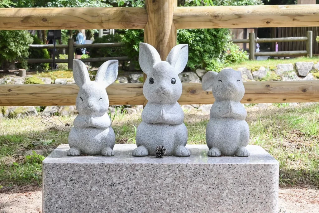 出雲大社のウサギ像は、『古事記』に記されている日本神話「因幡の白兎(いなばのしろうさぎ)」に登場する兎をモチーフにしている。この神話では、大国主大神(出雲大社の御祭神)が、傷つき苦しむ白兎を優しさと知恵で救い、その兎が恩返しとして「八上姫との縁を予言した」ことから、縁結びの象徴にもなっている。